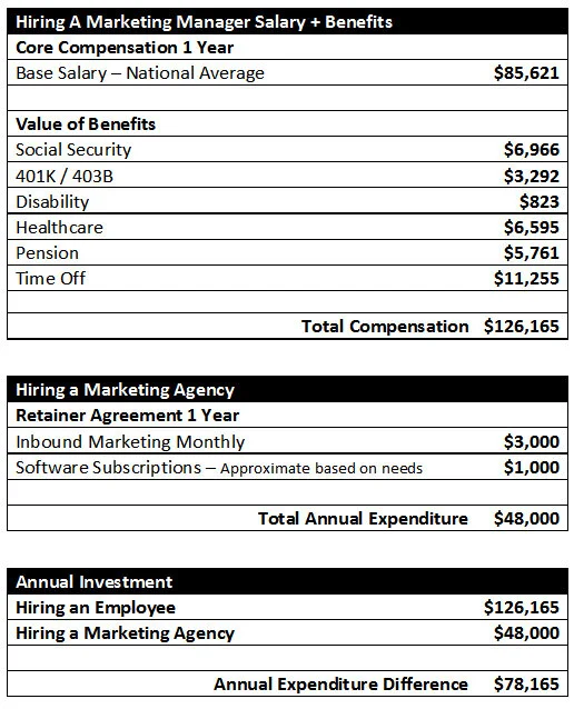 It may seem that doing it yourself is a money saver. But if you take a closer look you can see that this isn’t the case. Take a look at the cost comparison below. You can also look at the infographic HERE which plots out the services, costs and benefits of an agency vs. employee. The costs differences are astounding.